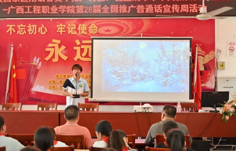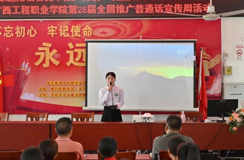 广西工程职业学院学生代表李奇鲜、莫代总还带来了精彩的朗诵表演。两人身着整齐服装,精神饱满地站上舞台,以标准流利的普通话朗诵经典篇目,语调时而激昂、时而舒缓,声情并茂的演绎极具感染力,台下不时响起阵阵热烈掌声。