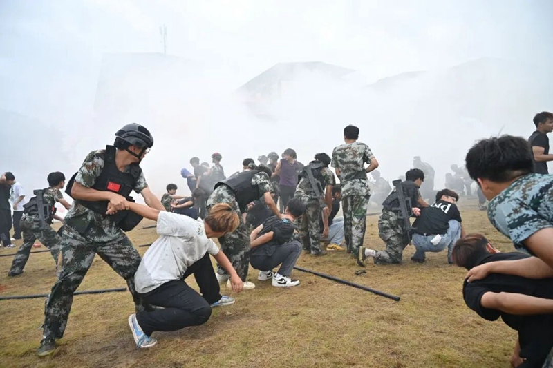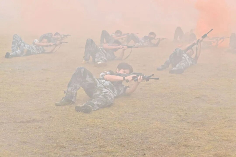 战士们身着防毒面具,手持仿真枪,在“硝烟”弥漫的场景中细致进行隐蔽侦查。他们默契配合,时而冲锋突击向前,时而格挡防御来袭,时而果断实施抱摔,成功深入“敌区”并解救“人质”。紧密的战术衔接、精准的指挥调度,再加上对“敌人”攻击的巧妙躲避,将一场模拟实战的紧张与高效展现得淋漓尽致。