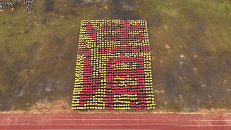 登高俯瞰,那些用卡纸摆成的字逐渐清晰映入眼帘。每一道笔画都浸透着同学们的努力与汗水,每一个成形的字都像在诉说着他们的执着信念,也散发着鼓舞人心的力量。