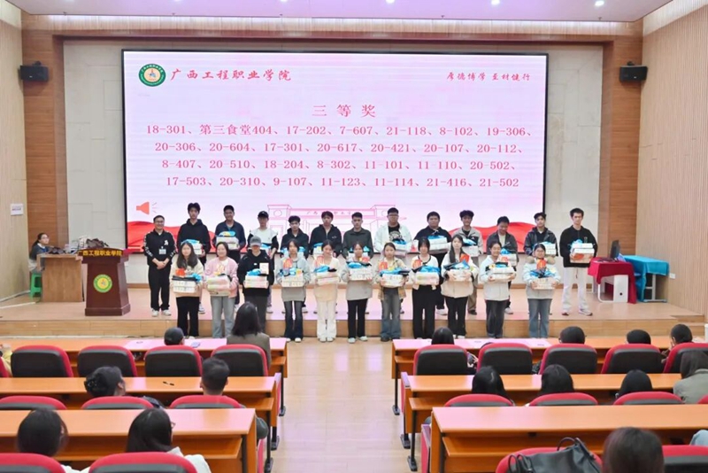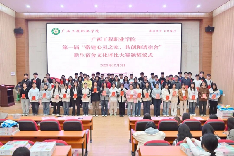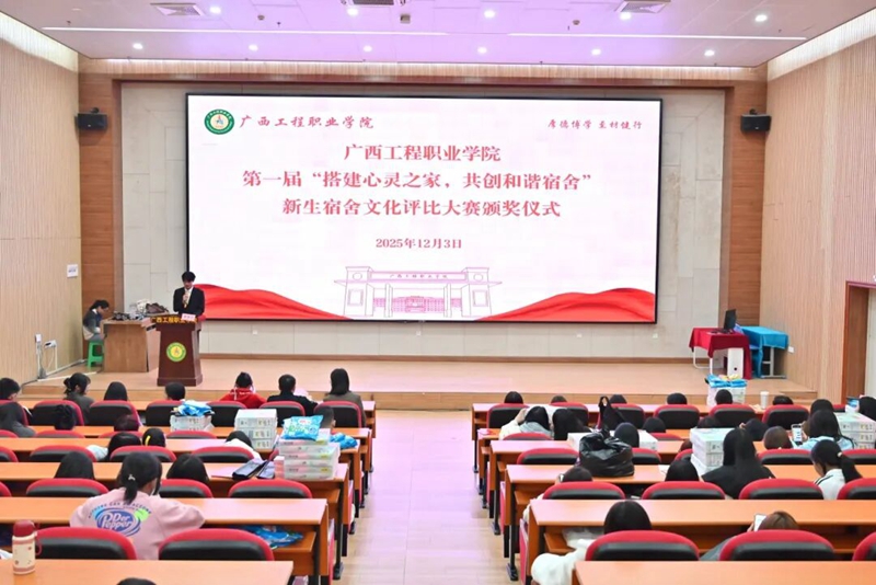 为营造温馨向上的宿舍氛围,帮助2025级新生融入宿舍集体生活,广西工程职业学院举行第一届以“搭建心灵之家,共创和谐宿舍”为主题的新生宿舍文化评比活动。活动于2025年10月20日启动,由学生工作处承办。评比活动历时一个多月,经过院级初赛、校级决赛,最终评选出一等奖10个宿舍、二等奖21个宿舍、三等奖28个宿舍。颁奖仪式于2025年12月3日在图文信息大楼一楼报告厅举行。