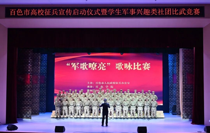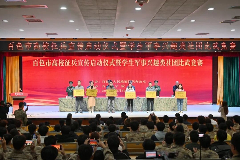 百色市高校征兵宣传启动仪式暨学生军事兴趣类社团比武竞赛于2025年12月29日-30日在百色学院澄碧湖校区举行。本次活动旨在激发广大高校学子投身国防、报效祖国的热情,同时展示各校军事类社团的建设成果与青春风采。广西工程职业学院选派精锐学生军事兴趣社团代表队参赛,凭借过硬的军事素养和昂扬的拼搏精神,在激烈的角逐中脱颖而出,以优异表现荣获团体总成绩第一名的佳绩,成为赛场上一道亮丽的风景线。