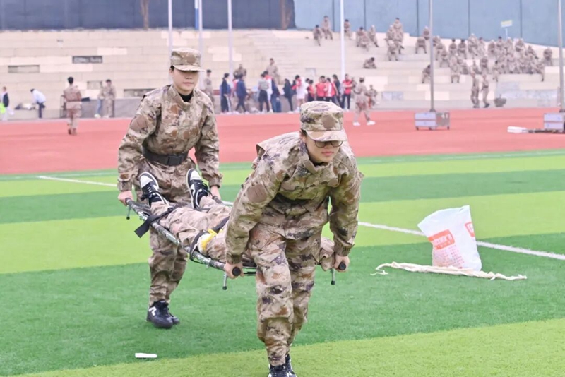 在模拟实战环境的战场救护项目中,我校队员操作熟练、配合默契,迅速完成伤员搜索、止血包扎、固定搬运等一系列动作,展现出高效的战场救护能力,荣获第二名。