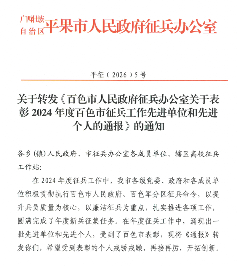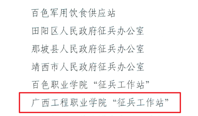 近日,百色市人民政府征兵办公室公布了《关于表彰2024年度百色市征兵工作先进单位和先进个人的通报》,对全市2024年征兵工作先进单位和先进个人进行通报表彰,广西工程职业学院被评为2024年度征兵工作先进单位!