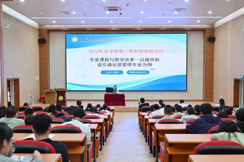 为进一步提升我校教学质量,搭建教师教学交流与经验分享平台,促进教师专业成长与学生学习效果提升,3月31日下午,广西工程职业学院2026年春季学期第一期教师常规培训在图文信息大楼一楼学术报告厅顺利开展,全体任课教师参加培训。智慧交通学院徐琳老师作题为《专业课程与教学改革——以城市轨道交通运营管理专业为例》的专题培训。