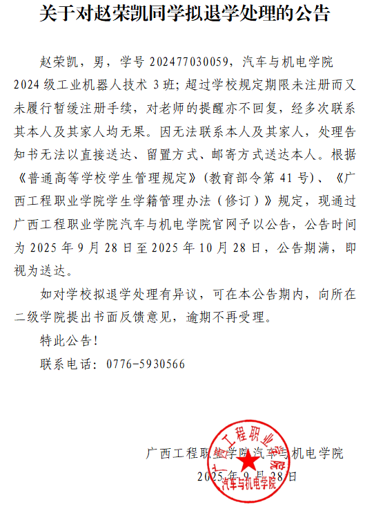 关于对赵荣凯同学拟退学处理的公告 时间:2025-09-28 10:49:46浏览:次来源:汽车与机电学院作者:卢燕梅 上一篇:关于对陆振富同学拟退学处理的公告 下一篇:关于对阮品超同学拟退学处理的公告 返回首页
