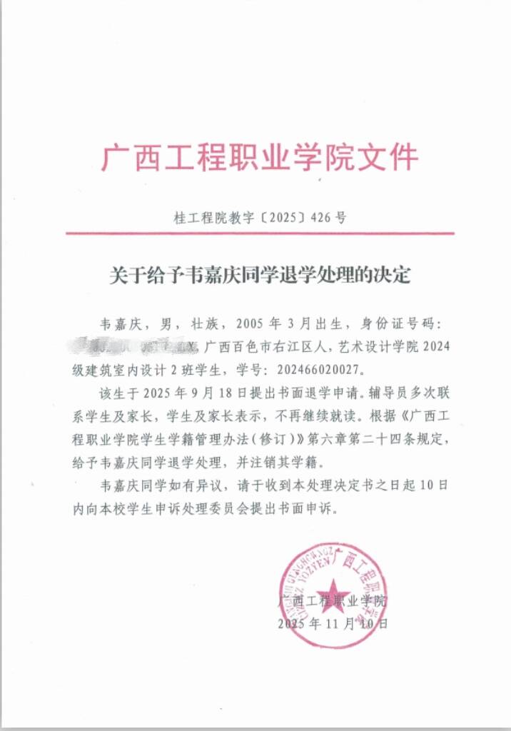 根据《普通高等学校学生管理规定》(教育部令第41号)《广西工程职业学院学生学籍管理办法(修订)》第二十四规定,给予韦嘉庆同学退学处理,同时注销其学籍。