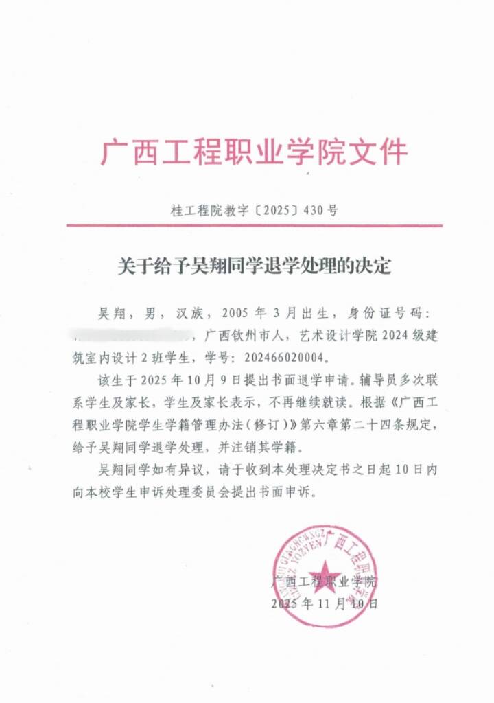 根据《普通高等学校学生管理规定》(教育部令第41号)《广西工程职业学院学生学籍管理办法(修订)》第二十四规定,给予吴翔同学退学处理,同时注销其学籍。