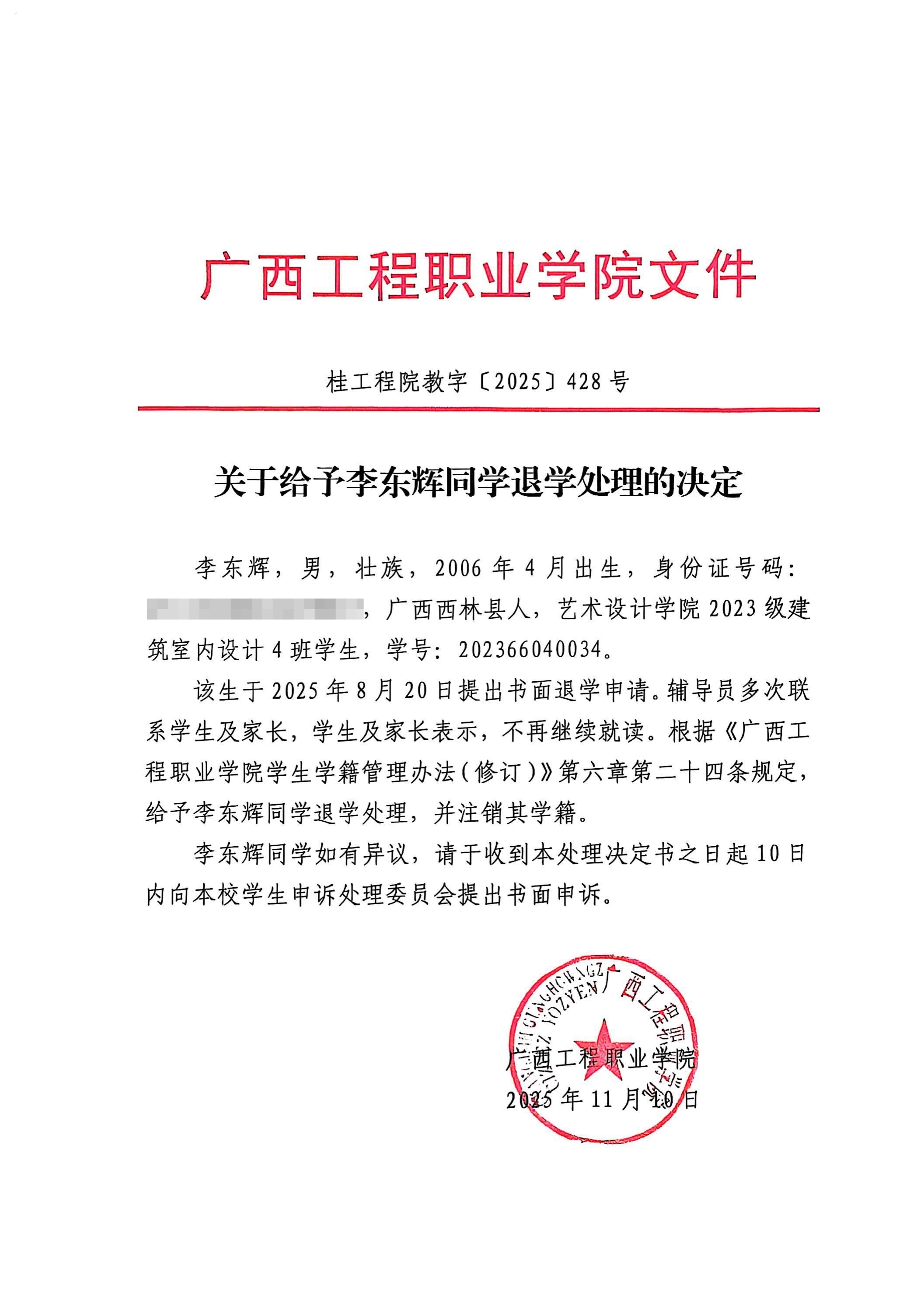 现根据《普通高等学校学生管理规定》(教育部令第41号)、《广西工程职业学院学生学籍管理办法(修订)》第二十四条规定,经学校校长办公会研究,决定给予李东辉退学处理,同时注销其学籍。
