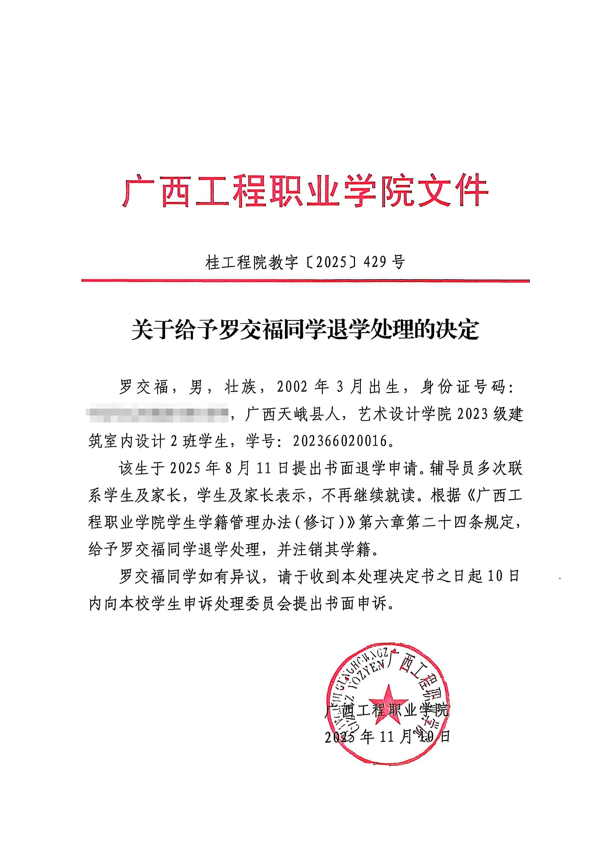 现根据《普通高等学校学生管理规定》(教育部令第41号)、《广西工程职业学院学生学籍管理办法(修订)》第二十四条规定,经学校校长办公会研究,决定给予罗交福退学处理,同时注销其学籍。