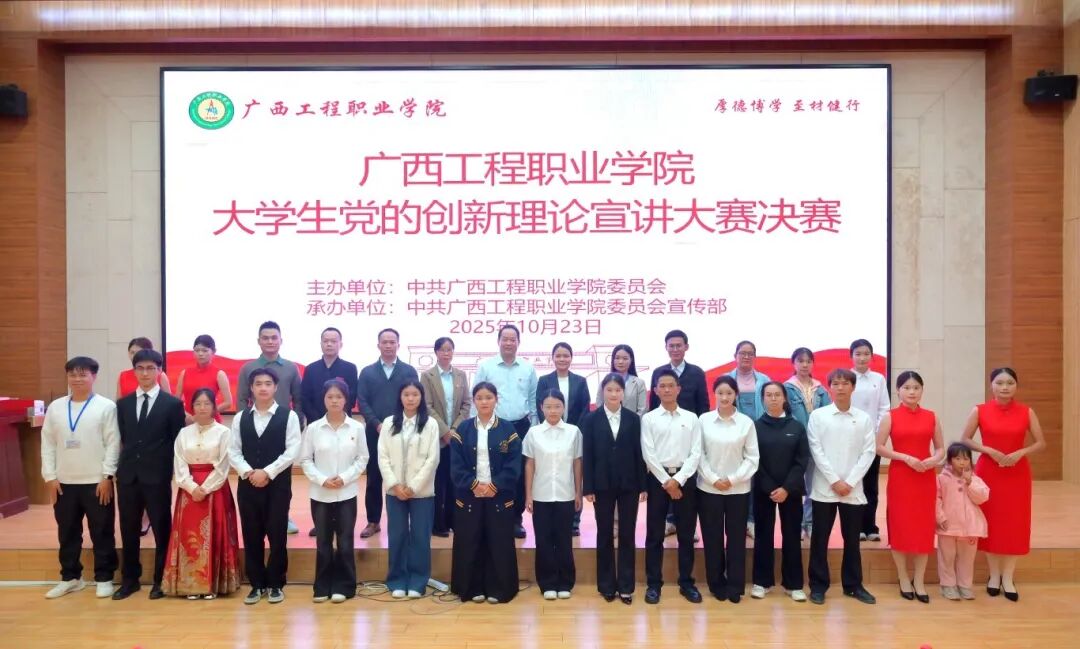 为进一步推动学习宣传贯彻习近平新时代中国特色社会主义思想走深走实走心,增进我校学生对党的创新理论的政治认同、思想认同、理论认同、情感认同,10月23日晚,广西工程职业学院大学生党的创新理论宣讲大赛决赛在图文信息大楼一楼学术报告厅举行。学校党委书记、政府督导专员蒙本曼出席现场,党委办公室、党委宣传部、各党组织书记(副书记)及二级学院师生代表400多人到场观赛。