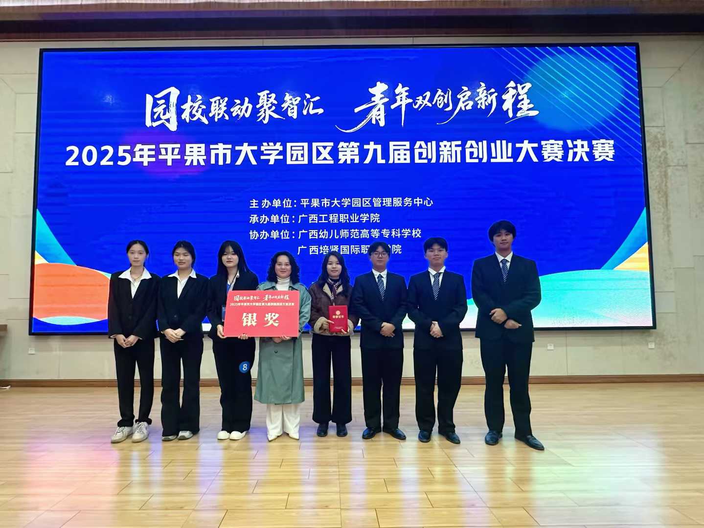 2025年11月20日,承载着创新与创业梦想的第九届平果市大学园区创新创业大赛决赛,在广西工程职业学院的舞台上圆满落下帷幕。本次大赛以“园校联动聚智汇,青年双创启新程”为主题,由平果市大学园区管理服务中心主办,广西工程职业学院承办,广西培贤国际职业学院、广西幼儿师范高等专科学校协办。大赛自启动以来,我校高度重视、精心部署,构建了“院级选拔—校级决赛—市级冲刺”三级培育与选拔体系,广泛动员各二级学院师生积极参与,形成了“全员关注、全员参与”的双创热潮。经过紧张激烈的比拼,由我院农淑娟、韦丽妮老师指导潘丽芳、唐晓圆、施慧、冯克勤、蓝吉龙、黄世康六名同学的项目《糖里·知食》凭借其鲜明的项目特色、紧密的团队协作、清晰的商业逻辑,在众多竞争者中脱颖而出,荣获此次比赛银奖。