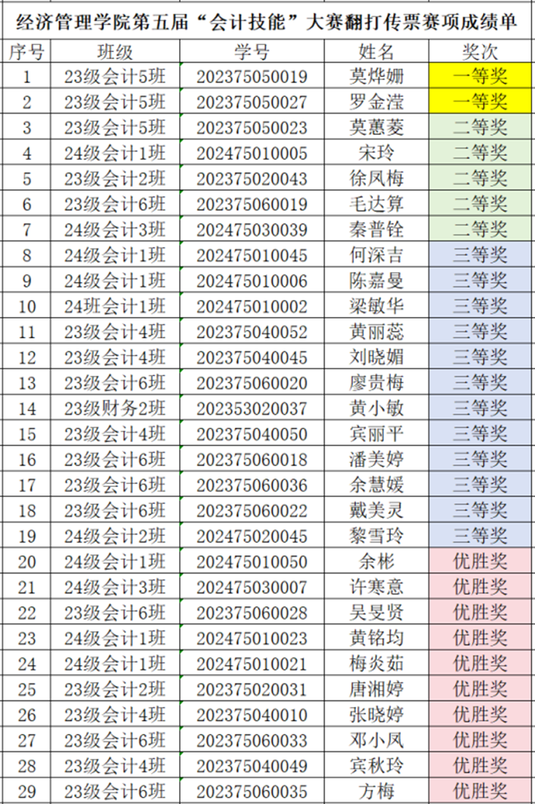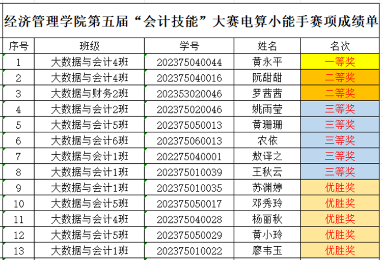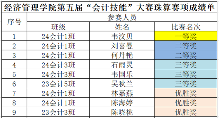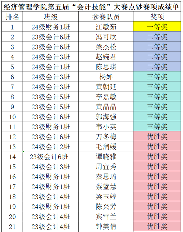 经济管理学院第五届会计技能大赛成绩揭晓,恭喜获奖选手!同学们在四大竞赛单元展现扎实功底,点钞利落、传票飞翻、珠算灵动、电算娴熟,希望大家秉持专业精神,在未来会计学习工作中发光发热。