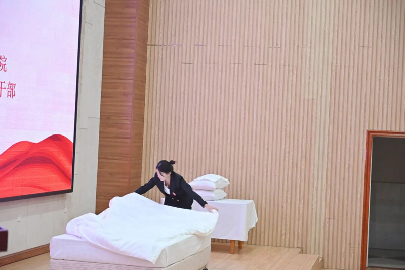 大赛赛程安排紧凑有序,各赛项依次顺利推进。12月16日19:00比赛拉开序幕,酒店服务技能比赛率先开展。参赛选手们精神饱满,在客房服务、中式铺床等实操环节中,严格遵循行业规范,娴熟展现客户接待、铺床等专业技能,细节之处彰显扎实的专业功底。