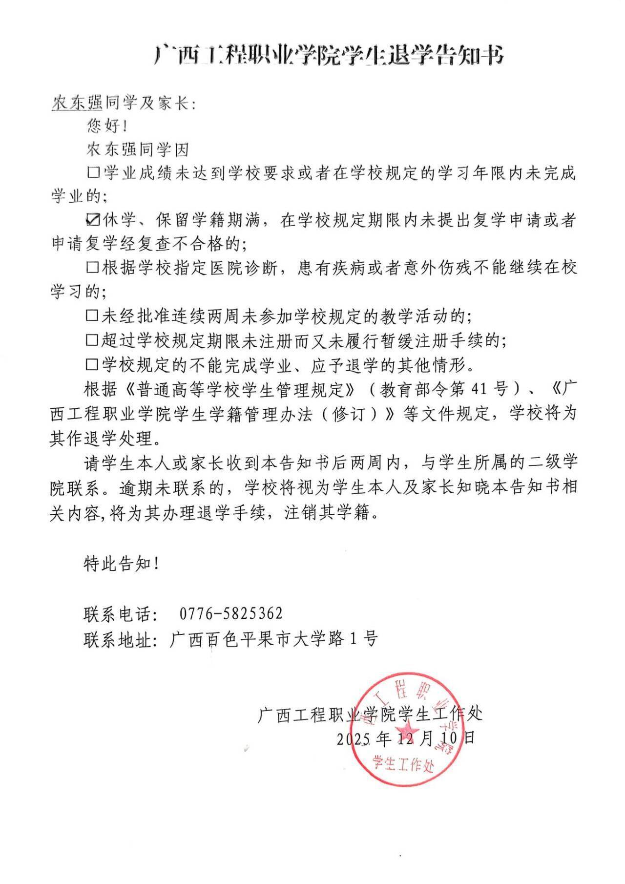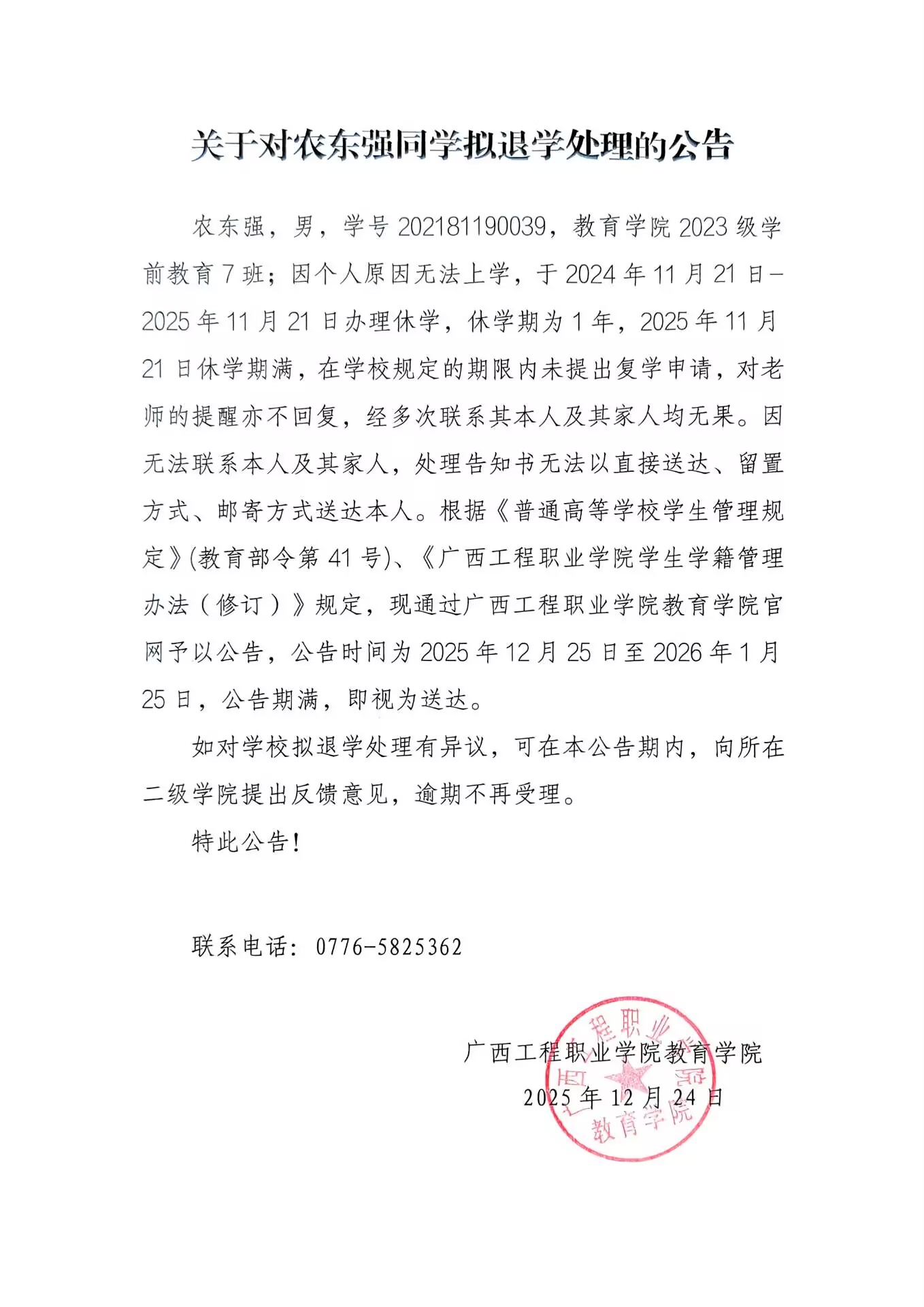 关于对农东强同学拟按退学处理的公告与告知书