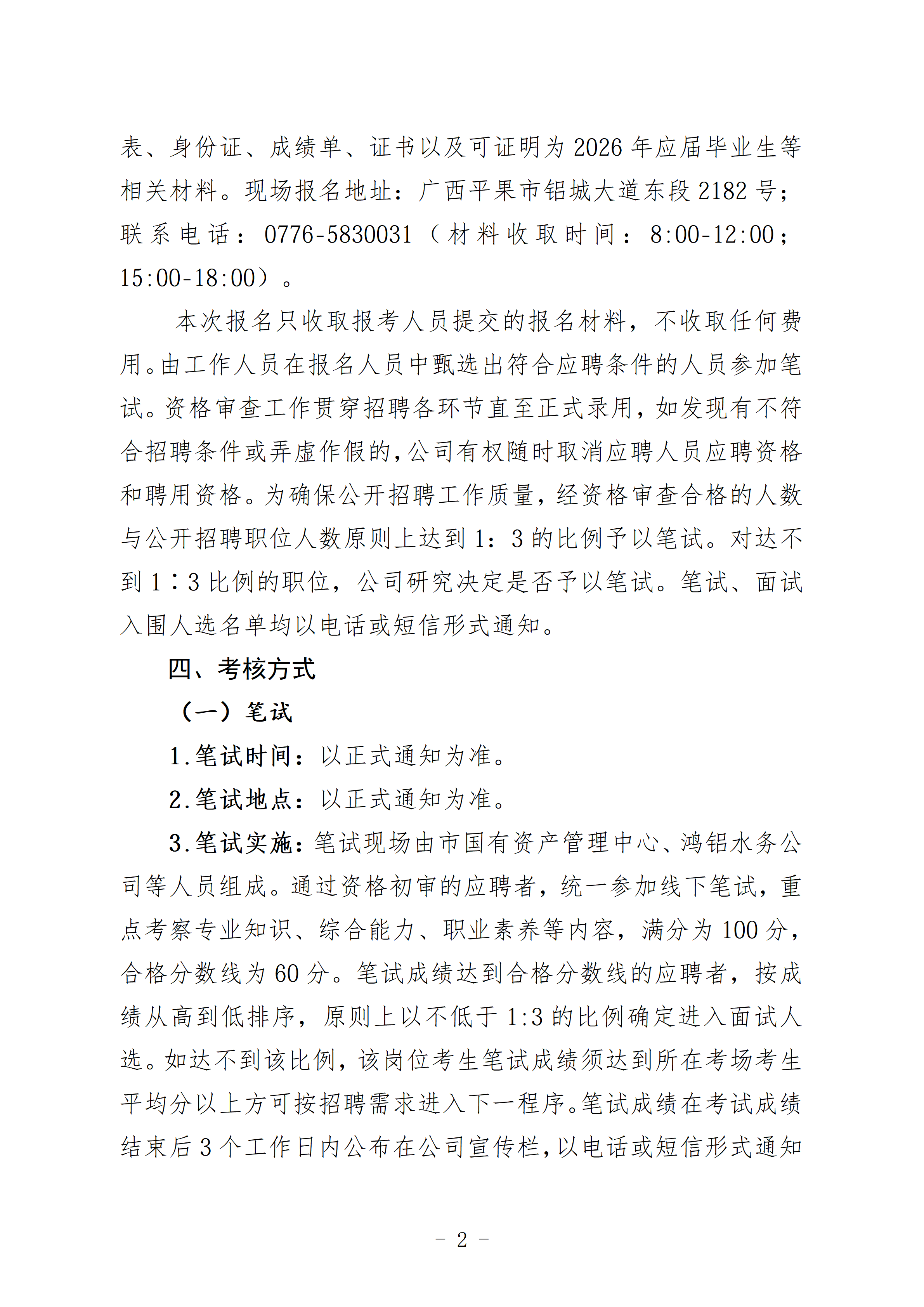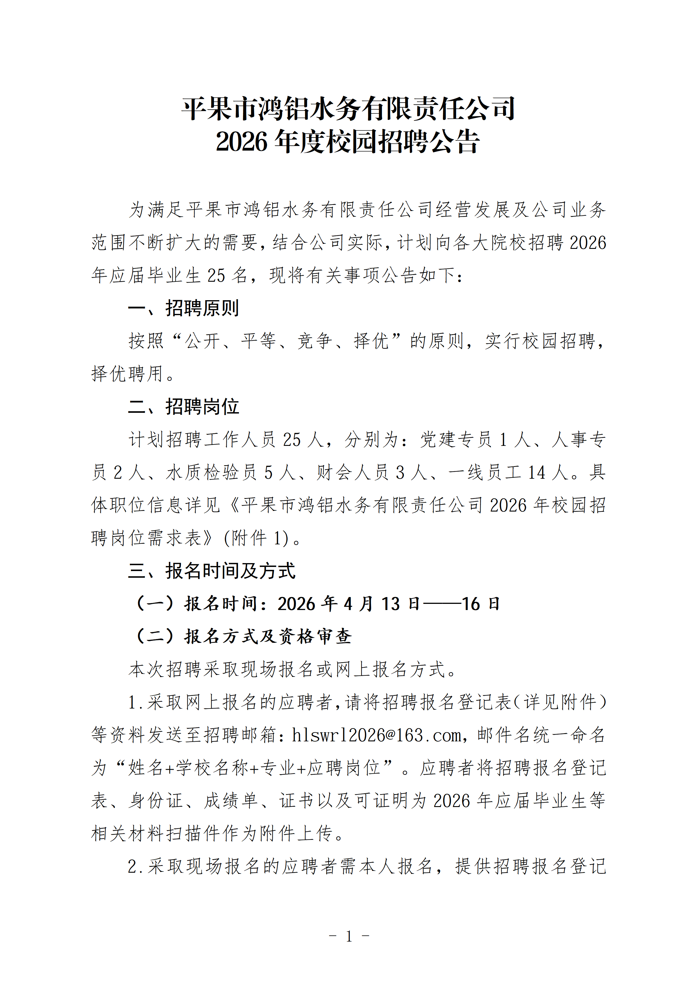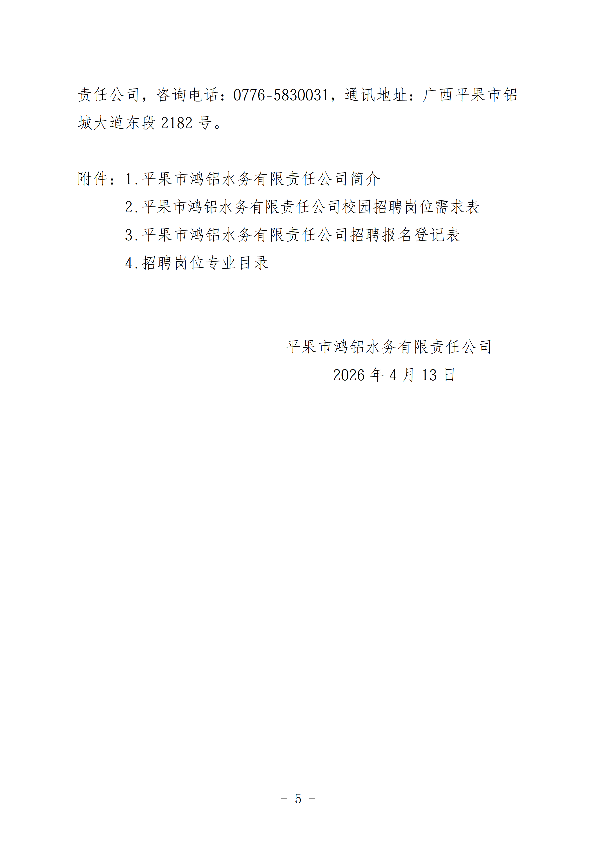 平果市鸿铝水务有限责任公司招聘信息 时间:2026-04-16 09:52:46浏览:次来源:平果市鸿铝水务有限责任公司人事处作者:庞泳 平果市鸿铝水务有限责任公司简介.doc aaa020442d2e81f4a16208f5eddc897e.doc (13.50 KB) 平果市鸿铝水务有限责任公司校园招聘岗位需求表.xls e6849b1ada60485bf864a090adb3b441.xls (18.00 KB) 平果市鸿铝水务有限责任公司招聘报名登记表.docx 75450a582f427a28faa253abec9bad7d.docx (16.83 KB) 招聘岗位专业目录.xlsx 5c90bda1a33e3c33feb4e8013d5b3f02.xlsx (14.53 KB) 上一篇:广西人才网、南南铝、林业集团等国企招聘实习生! 下一篇:返回列表 返回首页