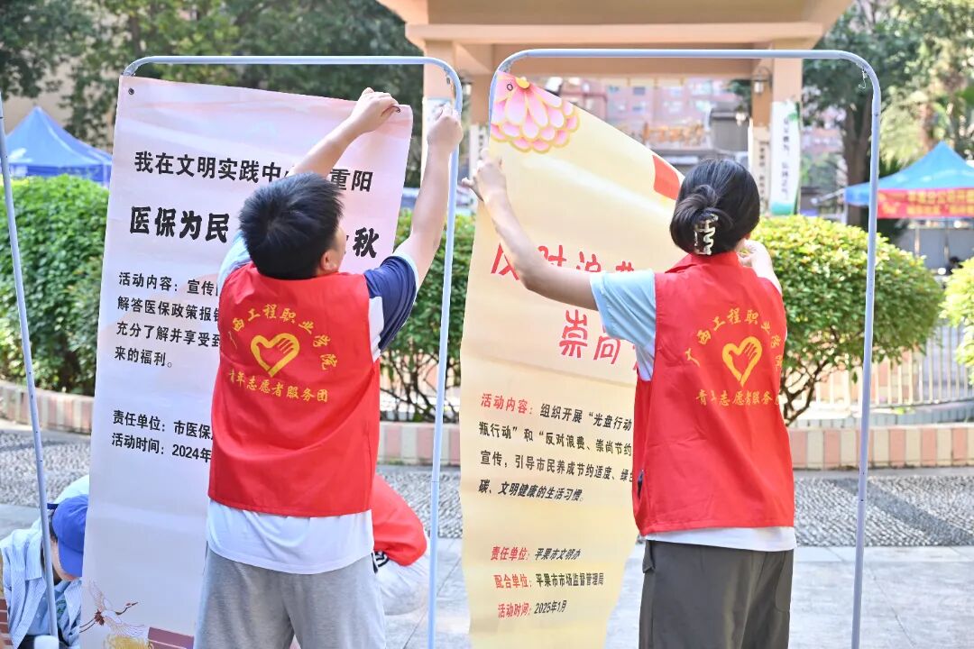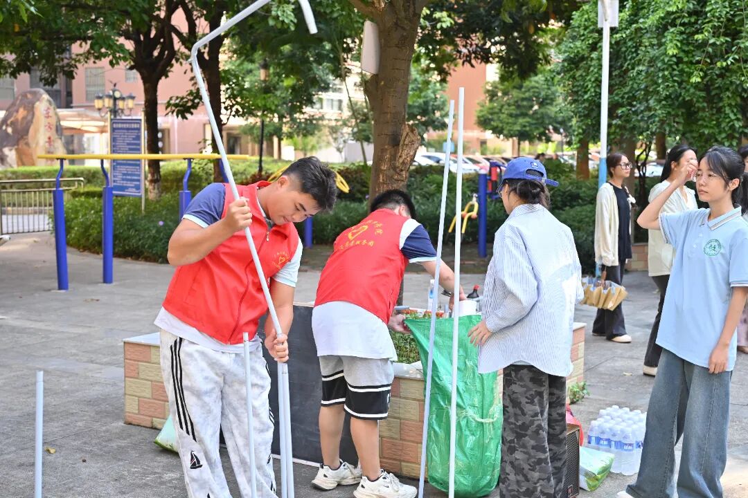 活动现场,志愿者们身着红色马甲,正默契配合组装活动器具,志愿者分工协作、有条不紊,为后续活动的顺利开展做好准备工作,展现出高效的团队协作精神。