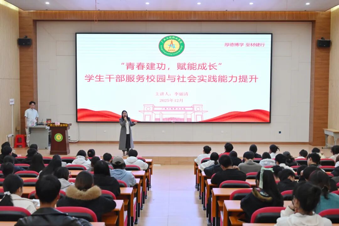 团委副书记李丽清以《青春建功・赋能成长——学生干部服务校园与社会实践能力提升的培训》为题开展主题培训,紧扣 “服务” 与 “实践” 核心,从 “坚守服务初心明晰职责担当”“深耕校园服务提升实操能力”“拓展实践视野赋能履职本领”“凝聚青春合力打造高效团队” 四个维度,通过案例拆解、技巧分享等务实形式,系统讲解学生干部在校园工作、社会实践中的核心技能与协作方法,助力学生干部将服务意识转化为实干本领,全面提升综合素养与履职效能。