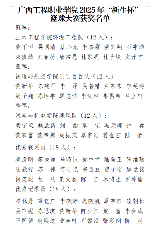 历经一段时间的激烈比拼,12月11日,广西工程职业学院2025年“新生杯”篮球大赛在体育馆迎来圆满收官。