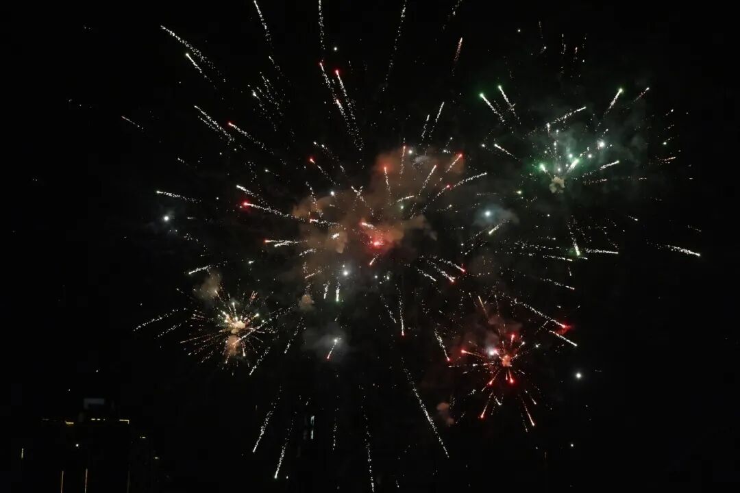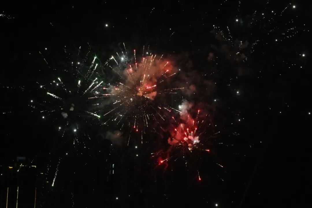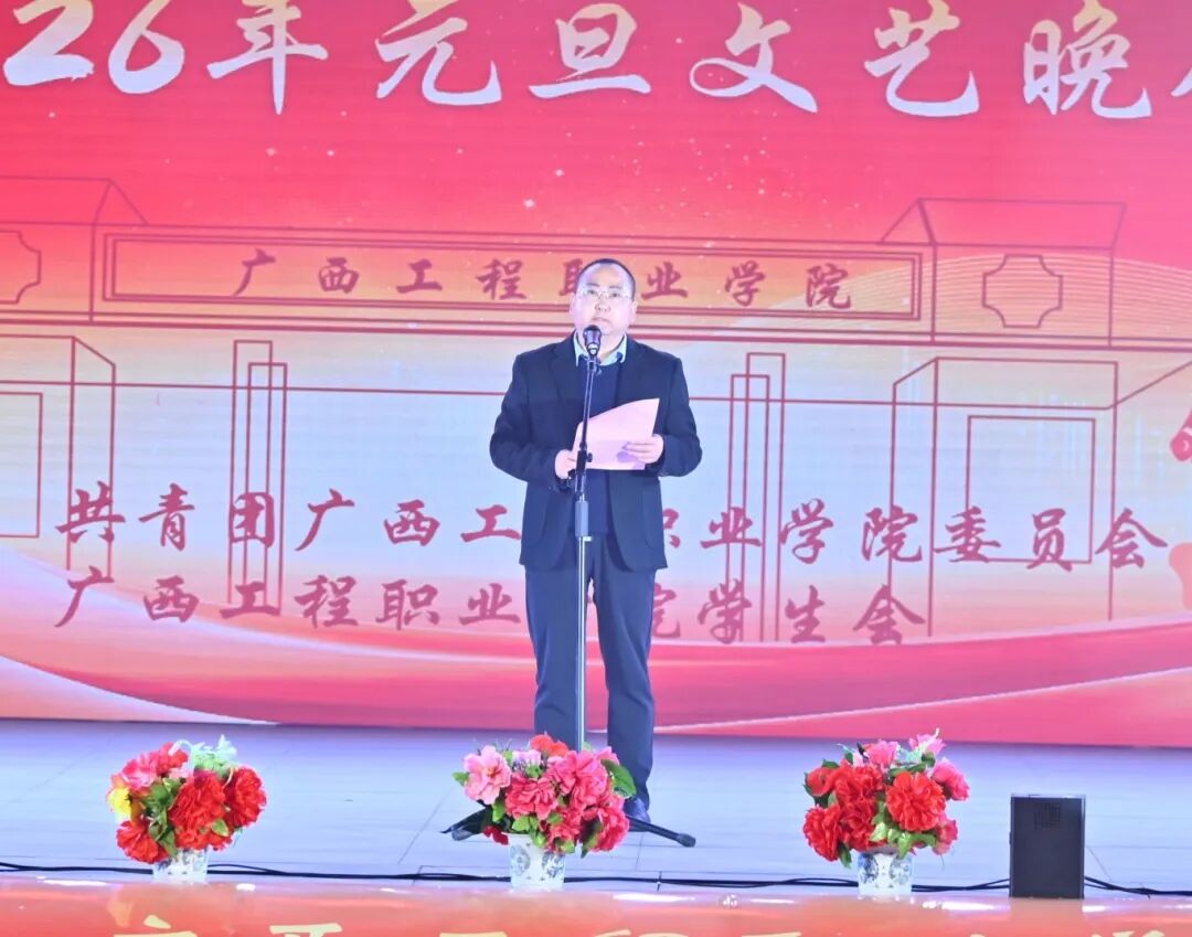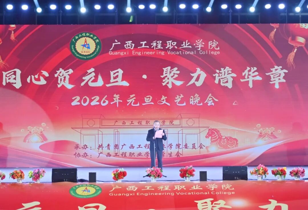 党委书记、政府督导专员蒙本曼宣布广西工程职业学院2026年元旦文艺晚会正式开始。话音刚落,几声清脆的声响划破夜空,绚烂的烟火骤然绽放。师生们纷纷举起手机记录这震撼浪漫的瞬间,欢呼声与惊叹声此起彼伏,为晚会拉开了极具仪式感的序幕。